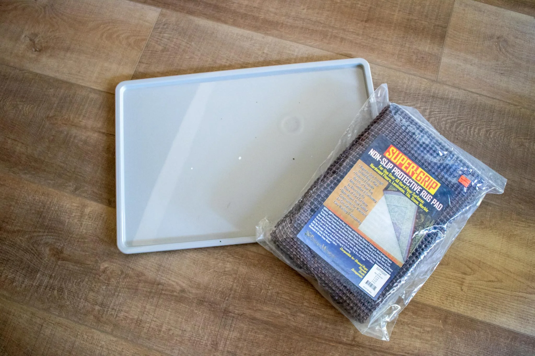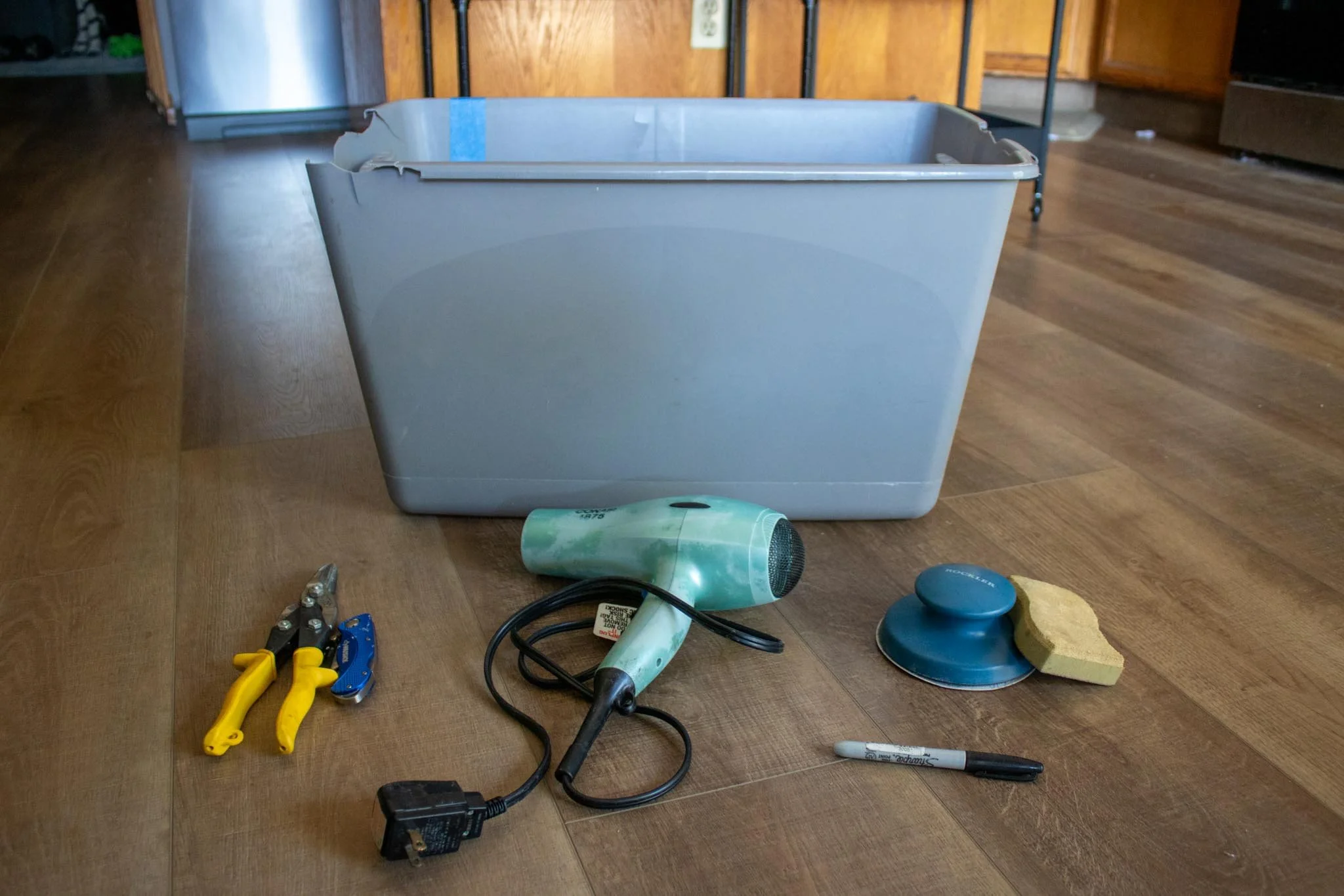 Supplies: A thin walled plastic tub (preferably a newer one) or an old litter box, scissors or tin snips or box cutter, a marker, sandpaper, face mask, hair dryer (optional), grip shelf liner (optional)